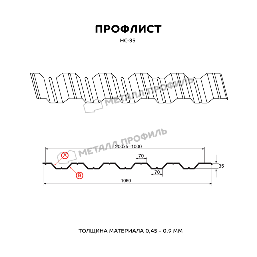 Универсальный и выгодный стройматериал с одинаковым с обеих сторон профилем. Маркировка НС значит, что профнастил является и «несущим», и «стеновым». Он пользуется популярностью как при строительстве частных домов, так и для индустриальных объектов. С помощью профнастила с глубиной волны в 35 мм создаются конструкции очень разного плана: каркасные здания ( цеха, торговые центры, склады ), обустройство кровли, ограждения частных и городских территорий, быстровозводимые сооружения ( павильоны, навесы ). Хорошую несущую способность НС-35 придают специальные канавки, проходящие с обеих сторон профлиста. Рабочая ширина материала составляет 1000 мм при полной ширине 1060 мм, таким образом, при установке этого металлопрофиля в боковой замок скроется 60 мм. Толщина стали имеет диапазон от 0,5 до 0,9 мм – это влияет не только на механическую прочность профнастила, но и его тяжесть. Полимерный слой из ассортимента Компани Металл Профиль добавит профлисту улучшенную стойкость к ржавению и ультрафиолету.